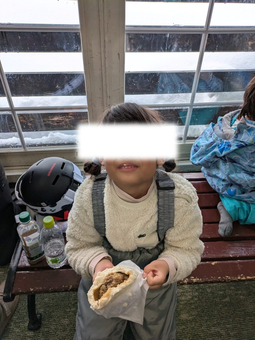 本格的に遊ぶ前にお腹を満たそうということで、ランチタイム。今回は売店で「越後名物もちぶたまん(500円)」を購入。レストランでゆっくりするより「早く遊びたい!」という子供の気持ちを優先しました。これが想像以上にボリューム満点!